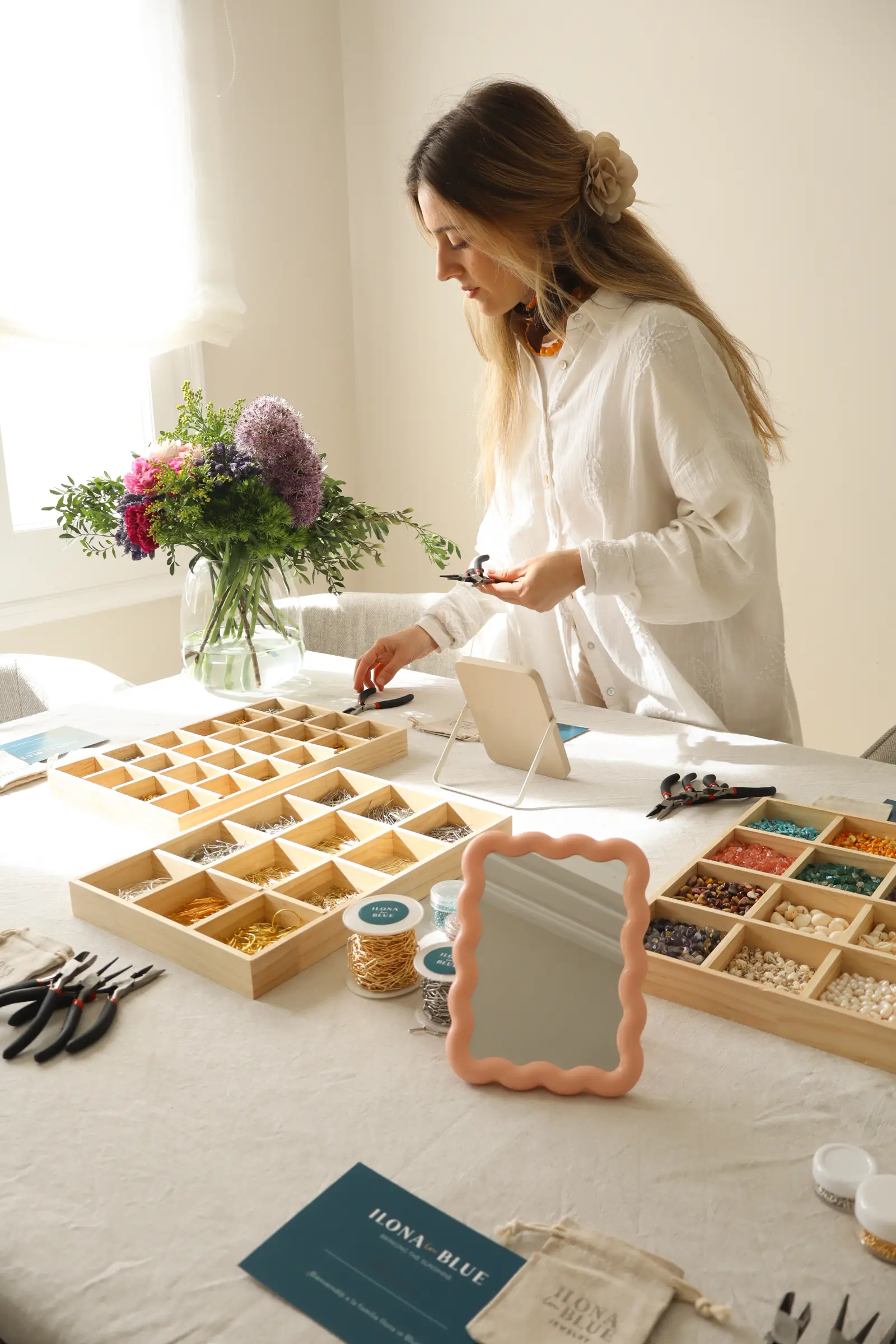 Un taller en el que diseñarás a tu gusto tus propias joyitas (collares, pendientes, pulseras...), en un entorno tranquilo y natural, conectando con tu alma y tu lado más creativo. Qué incluye • 2 horas de taller con atención personalizada para aprender distintas técnicas. • Todo el material necesario para hacer tus piezas (cadenas, piedras naturales, perlas, charms…) • Herramientas (no tienes que traer nada, te las prestamos en el taller) • Te llevarás tus piezas acabadas (Se harán 2 joyas por persona) • Packaging Ilona in Blue para tus joyas • Brunch, música y buena compañía! Nota: No se necesitan conocimientos previos. Dónde • Sant Cugat del Vallès. • Cerca del Parc Central • La dirección exacta se os enviará por privado, al correo de contacto que nos dejéis en el momento de hacer la compra del taller.